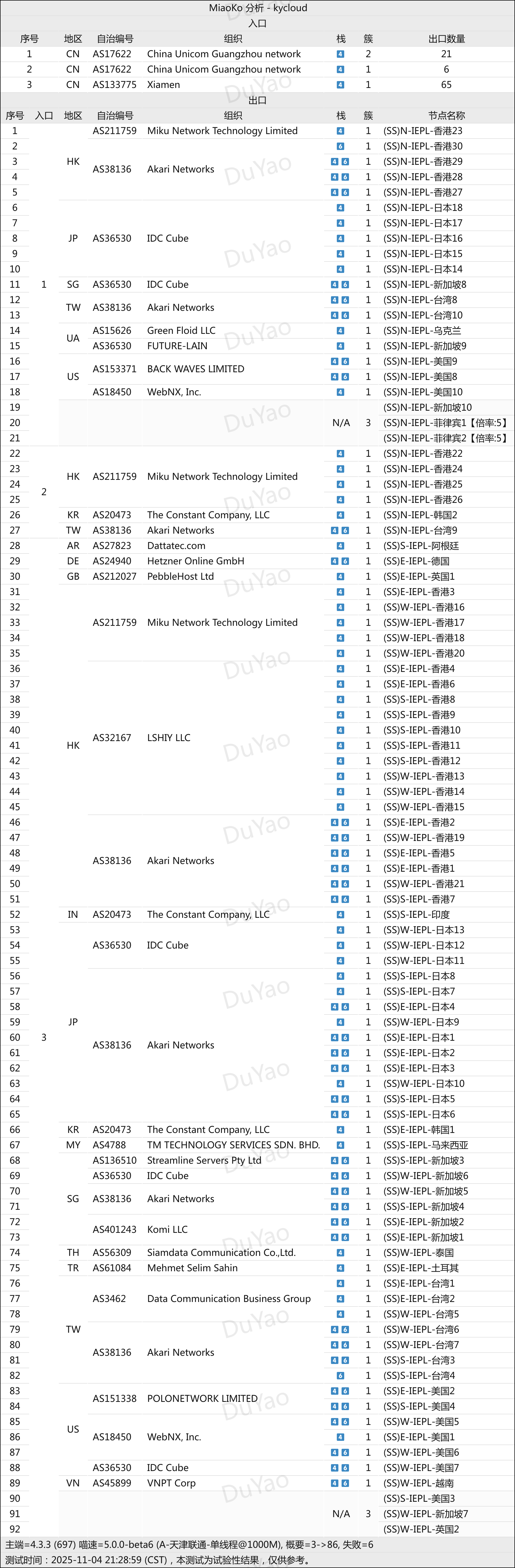 - 落地:香港 Akari、LSHIY、Polo;台湾 Hinet、Akari;日本 Akari、Vultr;新加坡 Speedy、Akari;美国 WebNX;越南 VPNT;德国 Hetzner等