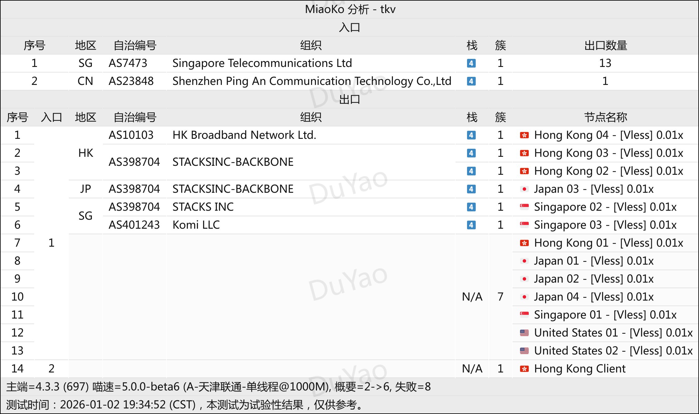 一家全中转SS协议机场,,因为名字比较像KTV,所以又被称为KTV。线路主要是广港IEPL、沪日IEP、京德IEPL,节点前置江苏电信高防入口、广东联通高防入口。节点配置流媒体解锁,并附带Telegram DC5 的专属SGGS线路优化。落地节点有香港MisakaF、Stacks,澳门CTM,台湾Akari,日本Akari、IIJ,新加坡Singtel、Akari、SpeedyPage,韩国KT,美国Misaka、Stacks,德国Hetzner、Misaka,荷兰Misaka。